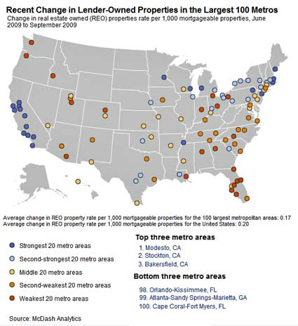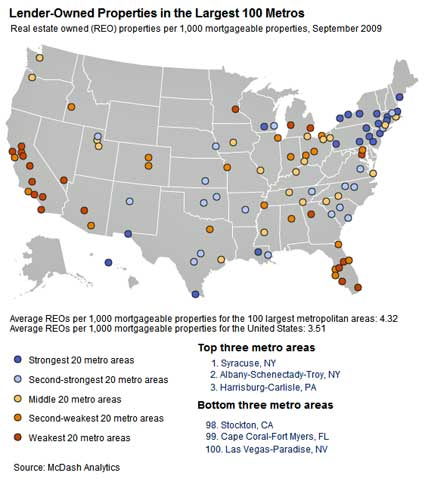 The Brookings Institute is out with some interesting data regarding foreclosures in the market through September 2009. First, they ranked metro areas by the number of REOs per one thousand mortgages. You can see on the following map what we already knew to be true: the highest levels are in the Southwest and Southeast — where all the red and orange dots are — and the lowest rates are in the Northeast — blue dots. You can see that Syracuse, NY had the lowest level of REOs where Las Vegas had the highest.