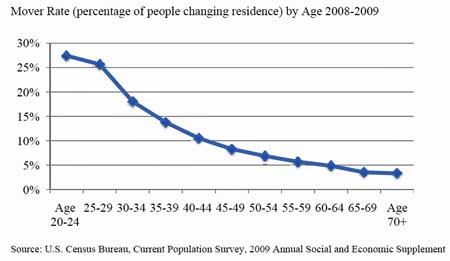 Here’s another graph, this time from the Census Bureau. It’s showing the ‘Mover Rate’ — which tells us who’s moving around out there. Again, it’s the under 35 set that’s moving the most. They are running around like chickens with their head cut off when what they should be doing is so simple: buy a home!